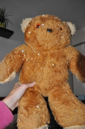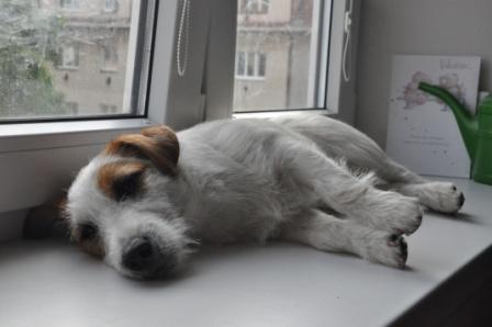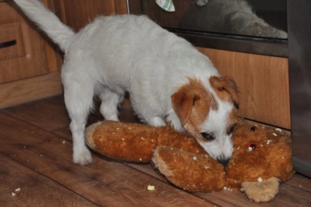 Dneska jsem Čakovi koupila plyšového medvěda v sekáči za 5 Kč. Jenže mi ho bylo líto, on se tvářil tak smutně a já jsem ho právě zachránila z útulku, tak jsem ho nechtěla Čakovi dát. Nakonec se ale spřátelili a Čak medvěda pečlivě rozpáral. Taky jsme mu koupili první pískací míček a z toho se Čakopes může zbláznit. Bereme ho jenom ven, aby se nezbláznili i sousedi, ale venku za ním Čak lítá, umí aportovat a i na přivolání krásně příjde, protože ví, že ho dostane za odměnu. Míček byl prokousnut už první den, ale pořád funguje a píská. A Čakoun pak doma leží na parapetu a kouká z okna a spí...
